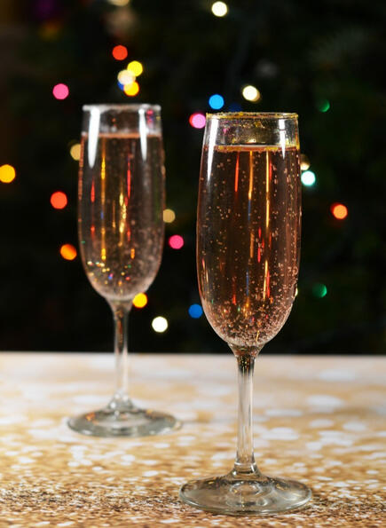 A fun, glittering bourbon drink to ring in the summer with a dash of gold! Bourbon, Honey Syrup, Lemon Juice, Orange Blossom water are shook together, strained over Champagne. A dusting of edible glitter and an orange slice on top fit this classy but high rolling drink!