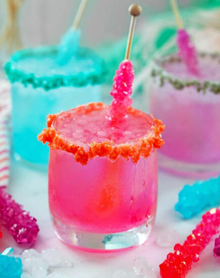 A great way to break in the summer with a bang! Our remix on a vodka soda, mix it up with a rock candy stir stick, with popping candy around the rim! Have a nostalgic beach day taste with Berry Blue or Passion Pink flavors!