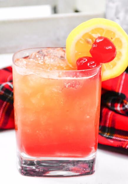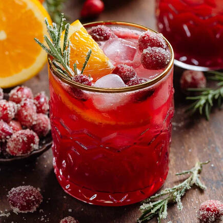 A fizzy blend of fall flavor, This twist on a cranberry smash is mixed with cranberry juice, sparkling cider, gin, and a dash of citrus. Garnished with rosemary sprig, candied cranberries and an orange wedge.