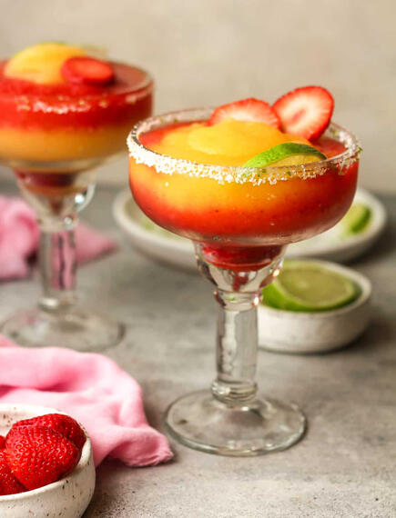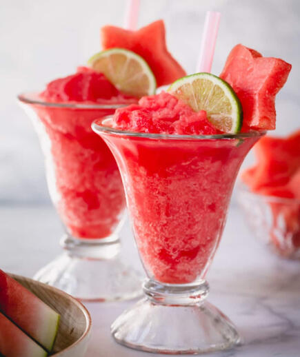 This refreshing frozen beverage is the perfect summer treat! Frozen watermelon blended with rum, sugar, and a squeeze of lime juice. Garnished with a star of watermelon and a wedge of lime.