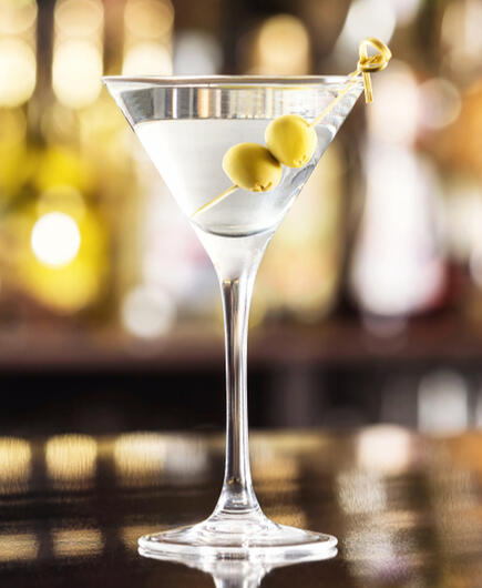 Always served shaken, not stirred! This gin martini is made with a splash of vermouth and olive brine, garnished with two olives on a toothpick.
