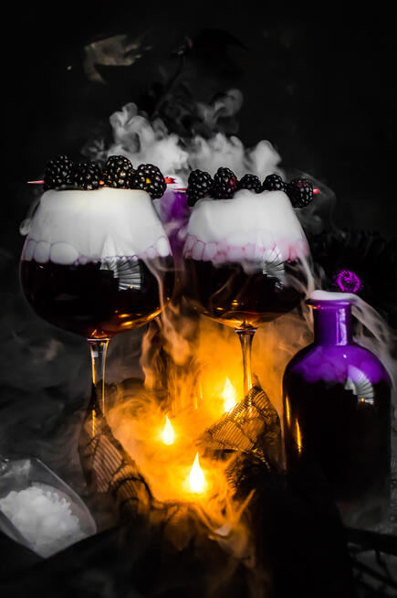 Don't let the name fool you, no voidsent were interacted with in the making of this brew. Made with smashed blackberries, a pinch of rosemary, lemon, mezcal, orange bitters, and a splash of sparkling water! With Billowing Fog, this smooth but tart drink will sink you into the All Saints' Spirit!