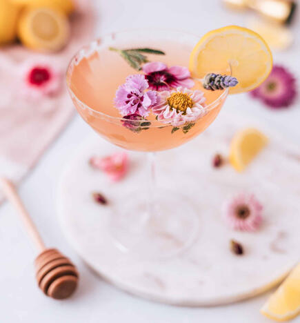 A simple but delightful drink to bring in the spring! With a simple mix of Gin, Pink Lemonade, and Honey in a wonderful tandem, you can't go wrong with something refreshing and fun. Garnished with flowers and lemon. Alcohol-free version available.