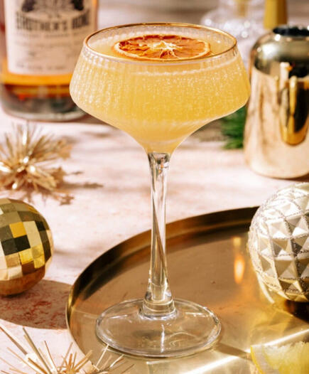 A fun, glittering bourbon drink to ring in the summer with a dash of gold! Bourbon, Honey Syrup, Lemon Juice, Orange Blossom water are shook together, strained over Champagne. A dusting of edible glitter and an orange slice on top fit this classy but high rolling drink!