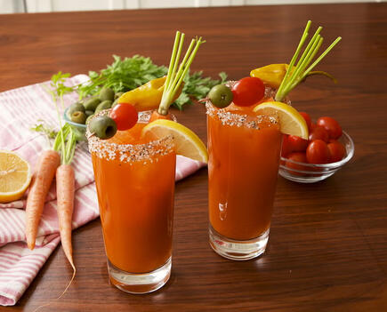 A Hatchingtide Twist on the Bloody Mary! Substituting the Tomato Juice for Carrot Juice, this vodka drink is the perfect for spring! The Lemon Juice, Honey Syrup, and hot sauce make for a fun flurry of flavors in your mouth. Garnished with a carrot, olives, cherry tomato, pepperoncini, and salt around the rim.